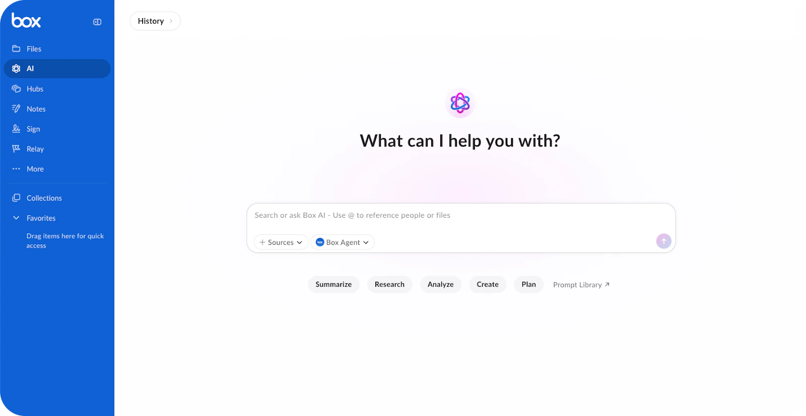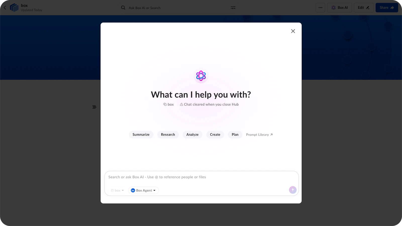 Select multiple files from the Files page, a folder, Collections, or search results, then click the Box AI button. A full-screen modal opens where you can query across all selected documents.Hubs