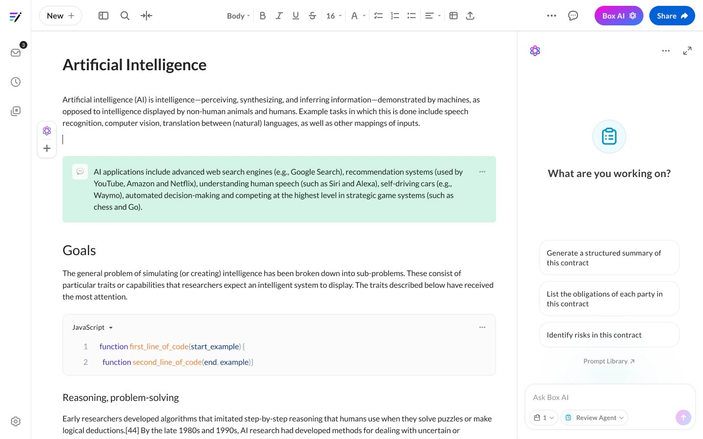 - Inline: Highlight text or position your cursor to invoke Box AI with that context