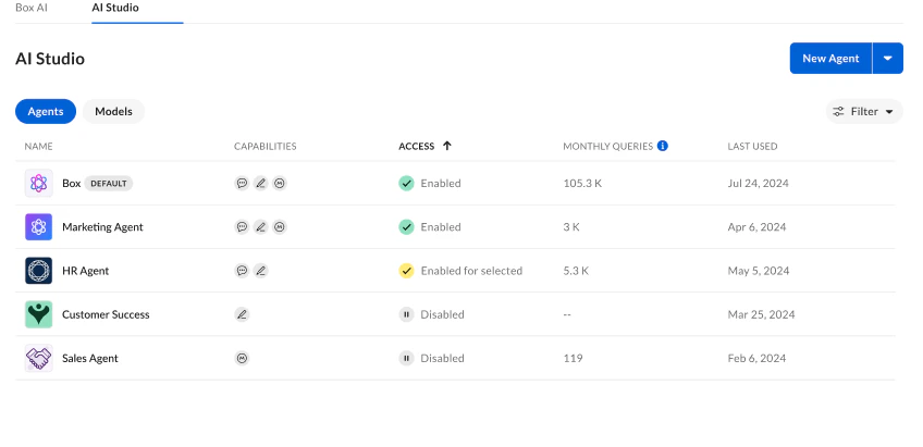To see a list of agents available, go to the AI Studio tab from the Box AI section in the Admin Console. From the Agent view, you can see:- Name