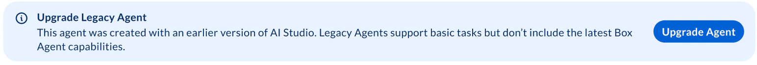 When accessing legacy agents, you can upgrade the agent to begin using updated features. When configuring a legacy agent, click Upgrade Agent to create a new agent that mirrors the legacy agent.
