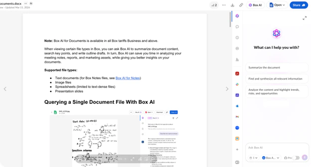 - Text documents (for Box Notes files, see Box AI for Notes)