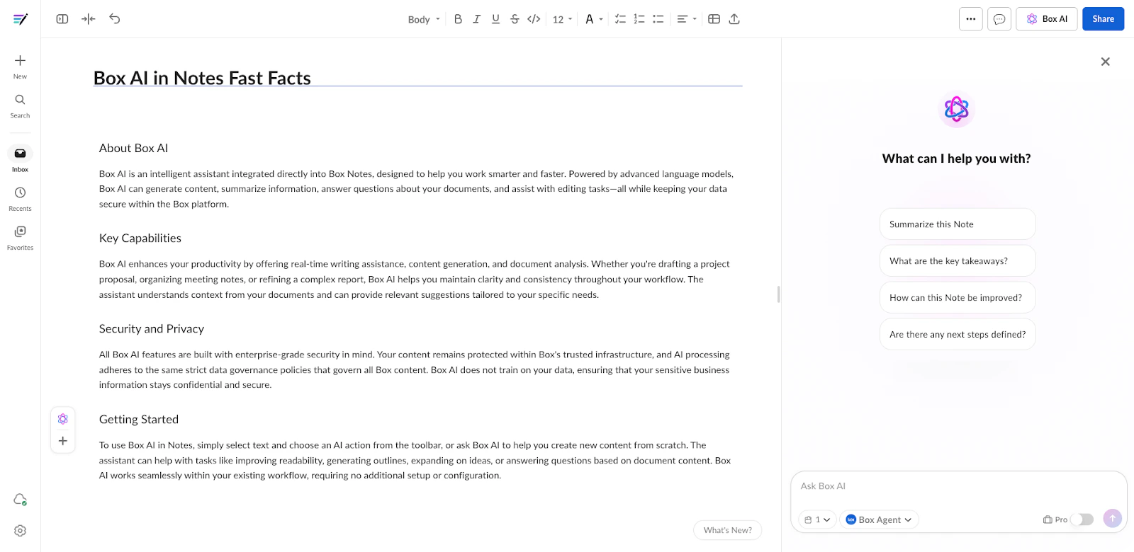 Get started creating or refining content with Box AI for Notes by opening a new or existing note.Content Generation