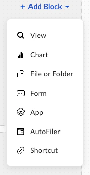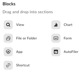 To add a block, drag and drop it to your section from the Blocks area under Configure App, or choose the + Add Blocks drop-down list in a section to add a new block to your app.NoteTo delete a block, select it and click the trash icon from the context menu.