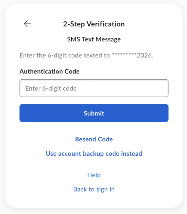 Two-step verification (sometimes referred to as two-factor authentication) is an additional layer of security to protect your account. The first factor is your password. The second factor typically is a code sent to your mobile device via SMS or a voice call, or accessed from a security application. Enter this code after typing in your username and password. This further verifies your identity before the system grants you access to your data. You or your account administrator can enable two-step verification. After you’ve done this, then after every time you enter your username and password, the system prompts you to enter a passcode. More information on enabling two-step verification.NoteTwo-step verification requires a device with which you can receive a passcode by an authentication app or SMS. If you do not have your device available, you can also log in with one of the backup codes you saved when you enabled multi-factor authentication for your account.