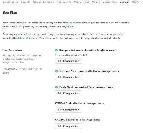 Admins can enable CAC/PIV authentication for signature requests in the Admin Console. To enable CAC/PIV authentication:- In the Admin Console, go to Enterprise Settings > the Box Sign tab.
