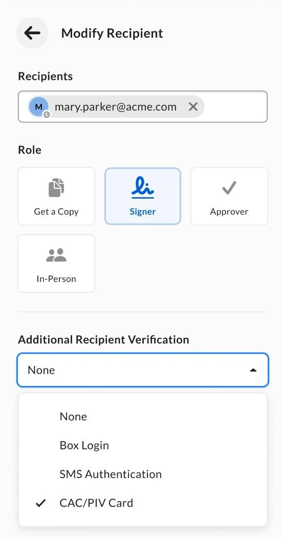 - CAC/PIV authentication can be used for some signers, while other recipients in the same signature request can be assigned other authentication methods (SMS, password, Box Login).