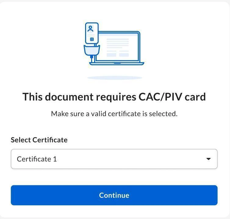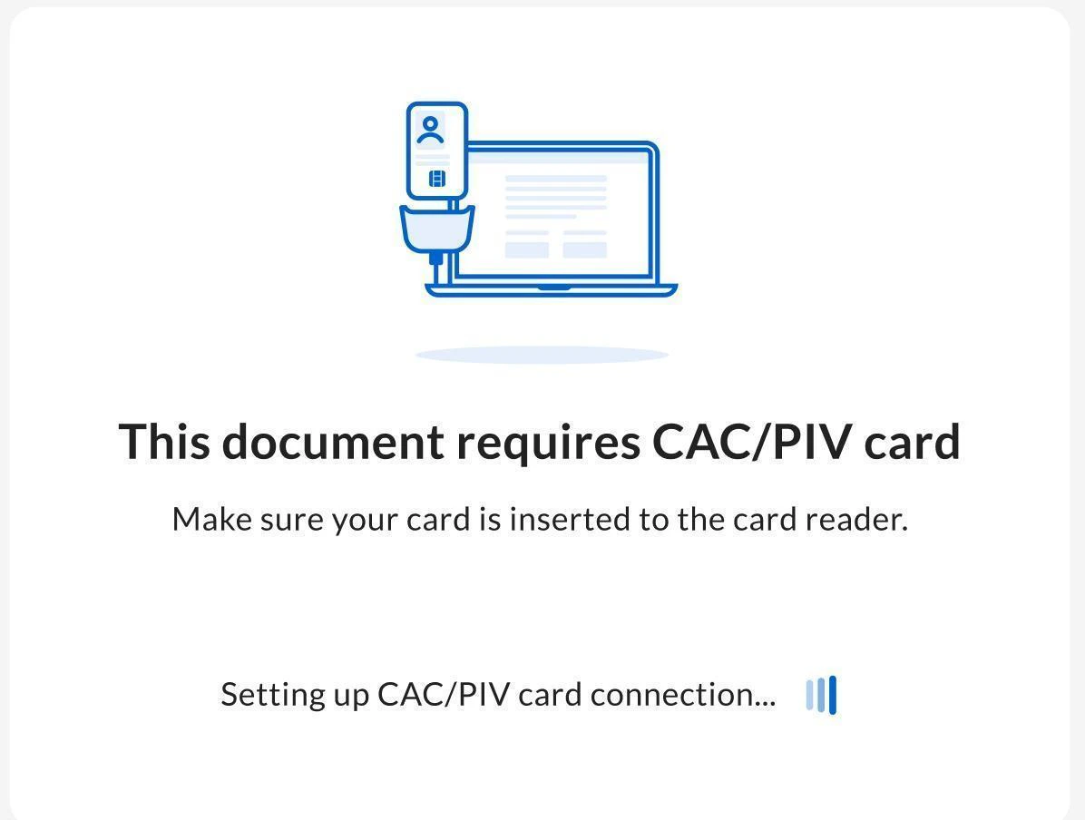 After a signer begins the signature request process, neither the sender, nor any other user who the signature request is shared with and has access to revise the request, can revise the request for that signer. However, the sender, or any other user who the signature request is shared with and has access to revise the request, can revise the request as described in Changing a sent signature request, including updating the CAC/PIV settings, before the signature request process begins. If a signature request doesn’t have a signing order, the sender cannot add CAC/PIV signers when revising the request.CAC/PIV Signing Process