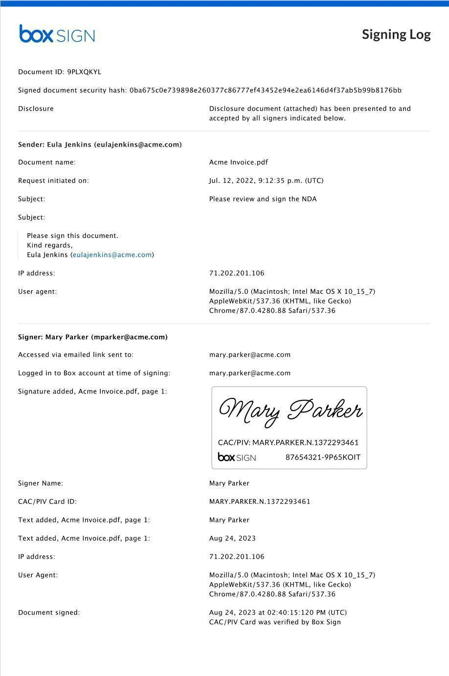 Once the signature request is complete, the signing log is available for review and reference. The signing log displays each CAC/PIV signature and authentication details as pictured below. You can learn how to access the signing log associated with each signature request here.