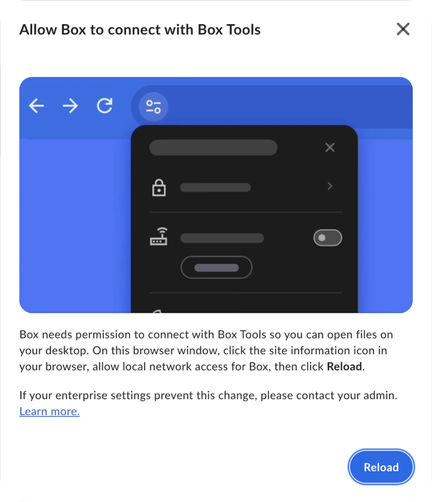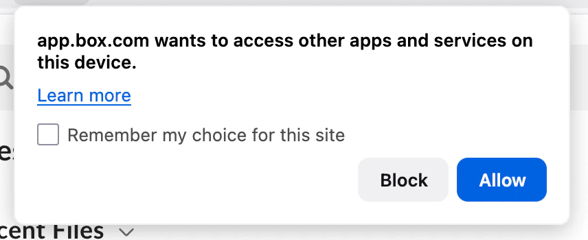 Users may see an unexpected browser permission prompt asking for local network access. Selecting “Block” will impact:- Box Edit (“Open in Desktop App”) will no longer function